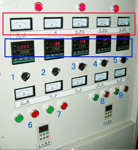 4、開關下面為主機電流表(8A) 風機電流表(~2A) 電源電壓 副機電流表(~1A) 備用電流表(XXX)