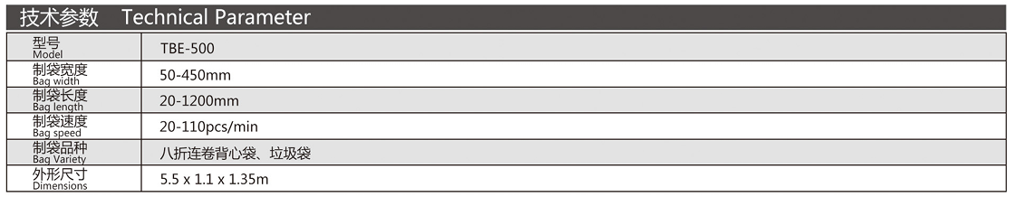 該機電腦控制,高位停車,自動放料,是生產垃圾袋、八折連卷背心袋、S型袋的理想設備。